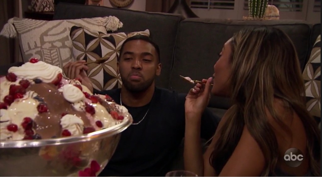It wasn’t a typical one-on-one where the couples have a public activity and then a private dinner in a public place. This entire date was private. In addition, it felt real, like the kind of date that would happen in the real non-Bachelor world where the travel and lodging is provided by somebody’s car driving over to somebody’s place and they order dinner in. Tayshia’s fabulous suite and the incredible room service aside – that dessert was MASSIVE – it’s the kind of COVID-related creativity on the producer’s part that made for good TV[1] in addition to helping further Ivan’s cause.