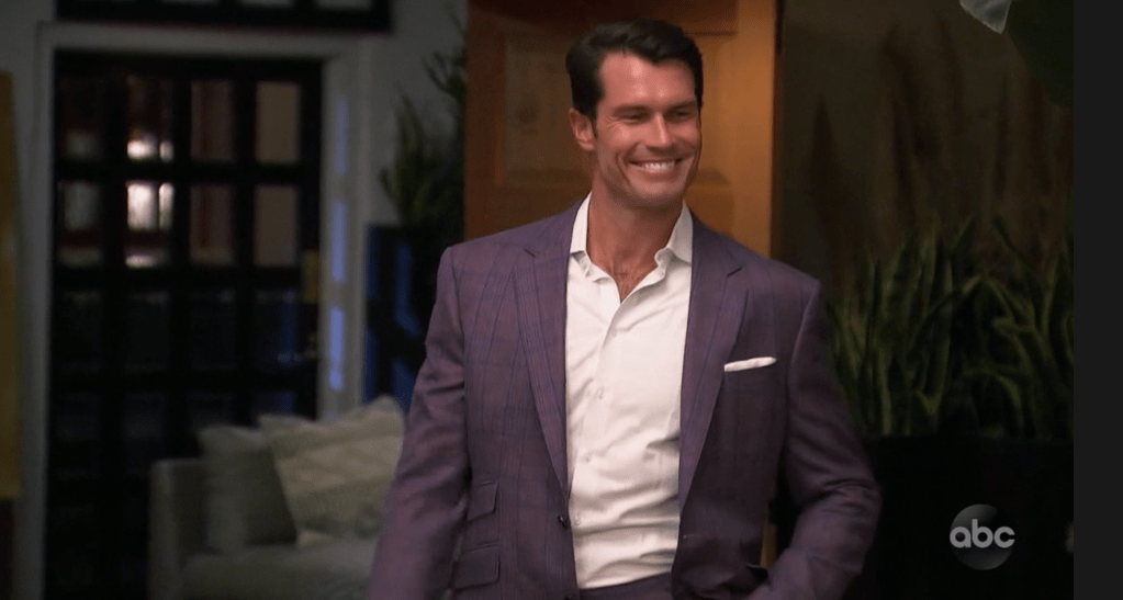 Our most recent episode was bookended by Bennett aka Wall $treet Dude now known as Bad Boy Bennett. One bookend had him being escorted out by Tayshia as the apparent loser of The Villain 1-Villain 2 Wars. The other bookend has him making an apparent triumphant return, if we are to believe the previews which we know can be highly problematic. If true, said return was foreshadowed in the inane lie detector test when Tayshia failed on the question of did she regret sending anybody home by saying “no”, thereby eliciting a beep from the Mac laptop and lighting up one of the Christmas tree lights.