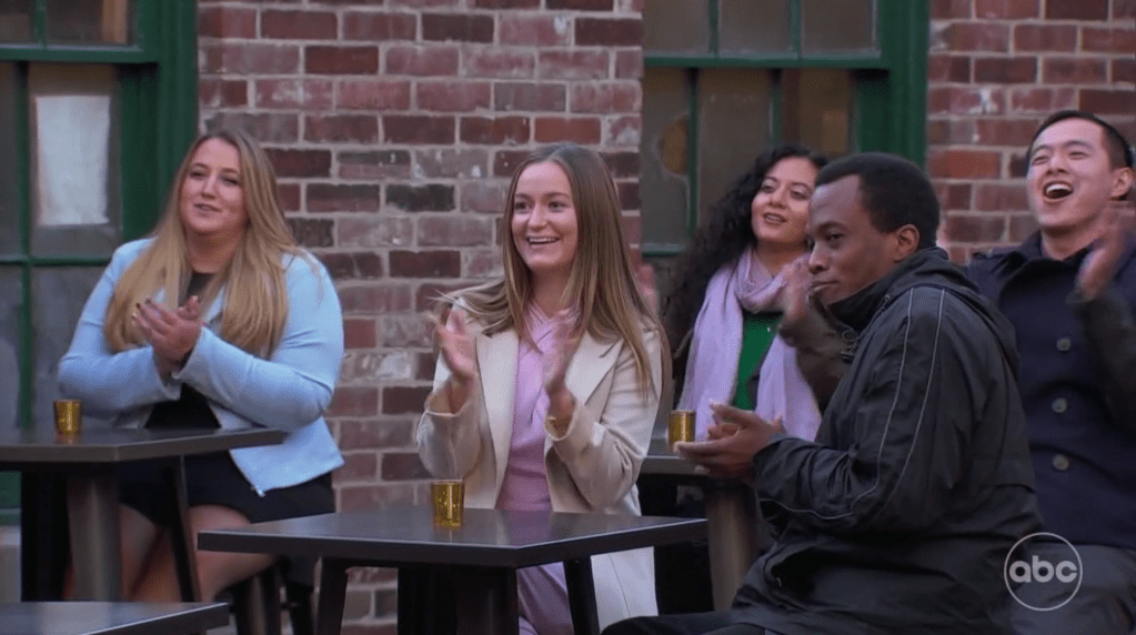 Serene gets a 1-on-1. They go to an amusement park and ride scary, loopy, droppy things. In a quiet moment Clay.IN says, “I think there is more to you than I’ve seen.” That would sound profound if you’ve known someone for more than a minute. But when you’ve only known someone for a minute, it sounds stupid.