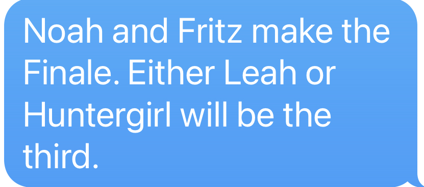 When Ryan called Huntergirl first, I thought that was the signal that Leah wasn’t in. It NEVER crossed my mind that Fritz wouldn’t make the Finale.