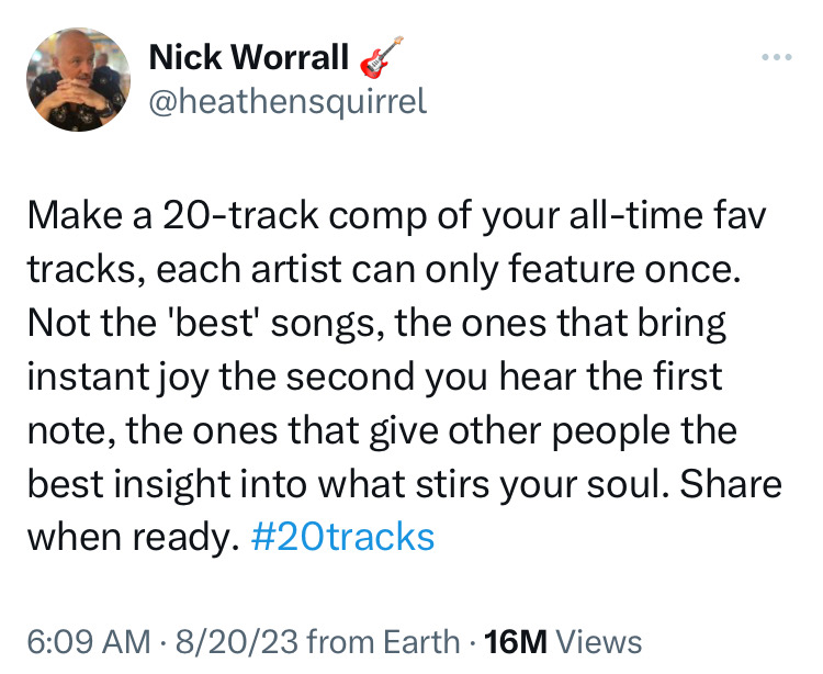 The first 14 songs came easily. Some time ago for reasons long forgotten, I had curated a playlist of 19 songs that I had an emotional attachment to. That was a good starting point for this challenge to which I applied the key criteria of “instant joy the second you hear the first note”.