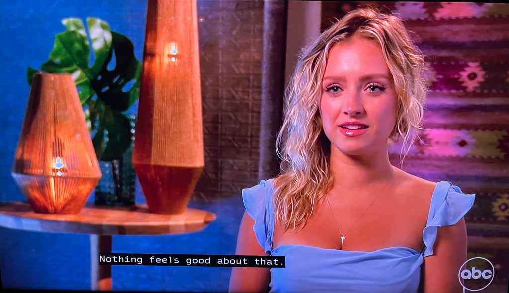 And we end with the usual Bachelor Bingo hyperbole about next week’s “shocking and emotional” conclusion. As always, the hyperbole was accompanied by the EGPs carefully curated clips designed to pre-shock us. But by then, my Bachelor Bingo card was full, and my wine glass was empty[2], so I didn’t feel much of anything. That said, I believe there is more drama ahead of us, likely in the form of a brutal breakup I’ve been predicting all season.