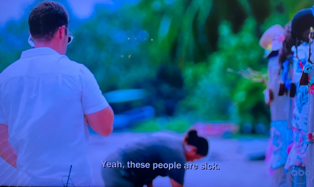 And just as we thought we were winding down to the finish – wait! There’s more! Another Test! Paradise ends next week, and the NEGPs needed to shoehorn in “The Sharp Knives” Test to eliminate two couples. This Test is introduced with an indecipherable riddle, followed by Jesse’s usual incomprehensible instructions.